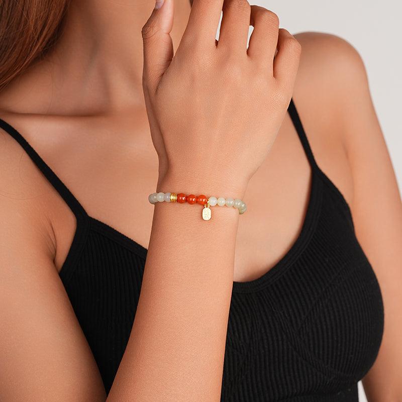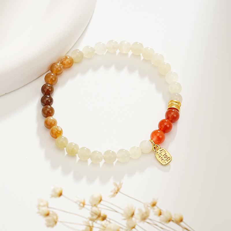 [Bracelet Story] The design inspiration of "Warm Ginger Tea" comes from a cup of warm ginger tea in the cold winter, which has the effects of dispelling cold and nourishing the body, making you feel warm from the stomach to the heart. The effects brought by this string of bracelets are the same. The gradually changing Hetian sugar jade, clear "clear-water" Hetian jade and southern red agate also give a warm feeling visually. The raw materials of this string of bracelets come from regions such as Xinjiang, Qinghai and Sichuan in China. It is a combination of Chinese tea culture and jade culture. It can moisten and beautify the skin, regulate emotions and enhance personal temperament, and is very suitable for girls to wear.